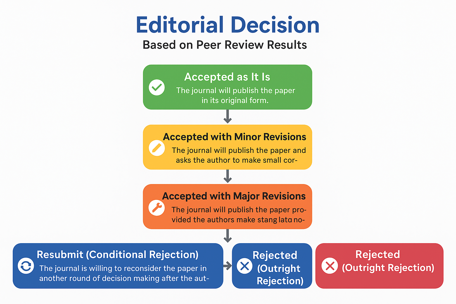 The editor or editorial board considers the feedback provided by the peer reviewers and arrives at a decision. The following are the most common decisions: