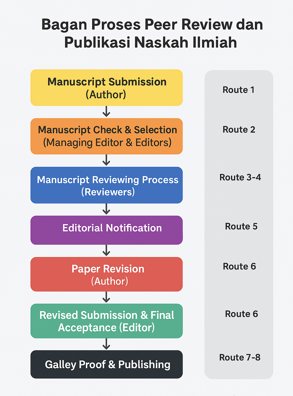 - Manuscript Check and Selection (by manager and editors) (route 2). Editors have a right to directly accept, reject, or review. Prior to further processing steps, plagiarism check using Turnitin is applied for each manuscript.